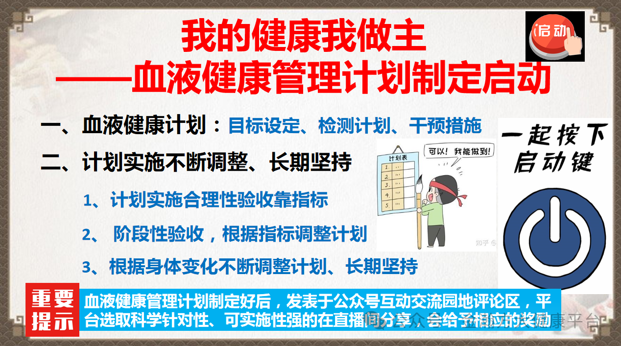 病前主动防,病后科学地管。为了让大家能够科学地做好自我血液健康管理,贾老师在直播中发布了一个倡议,希望您能在平台的协助下,根据自身的健康状况,制定一个血液健康管理计划。